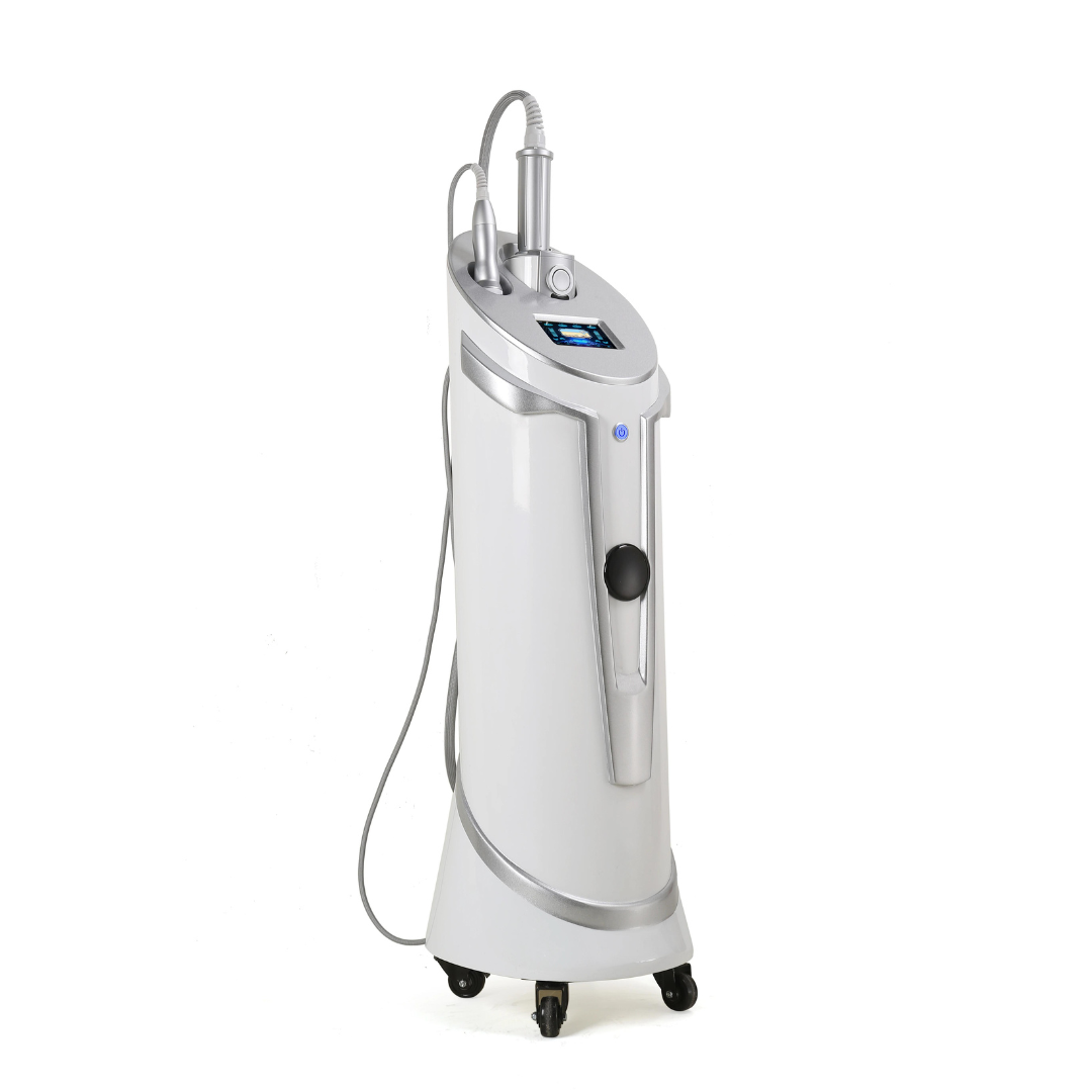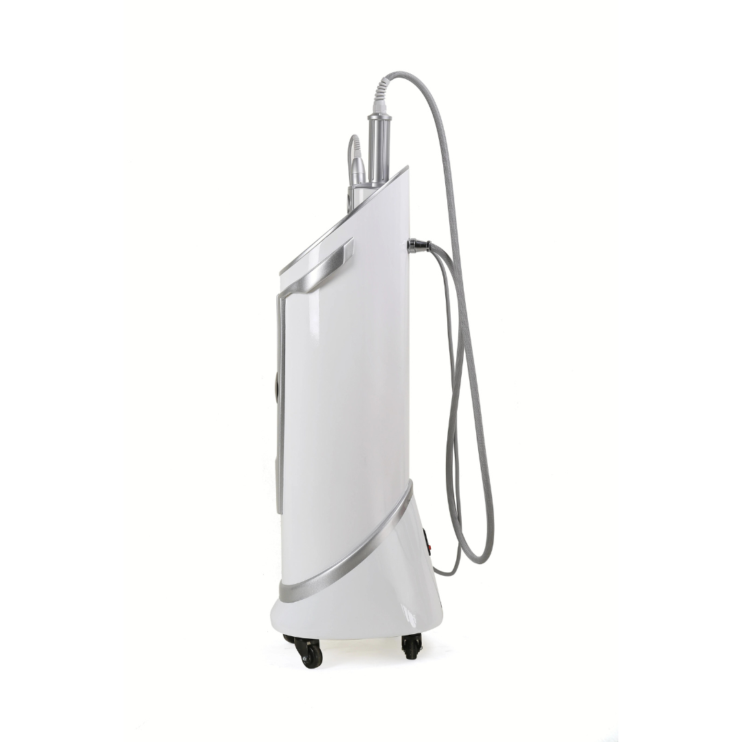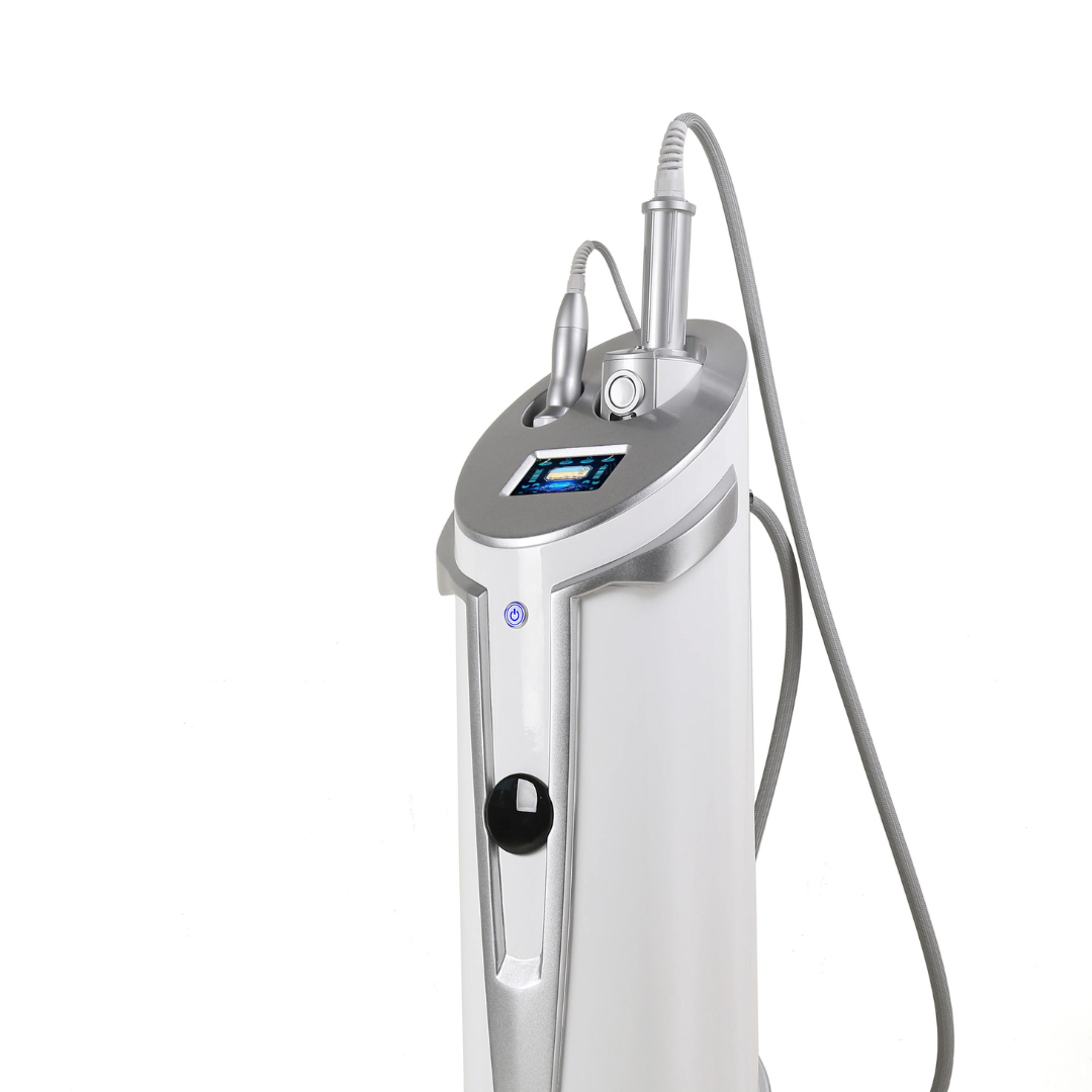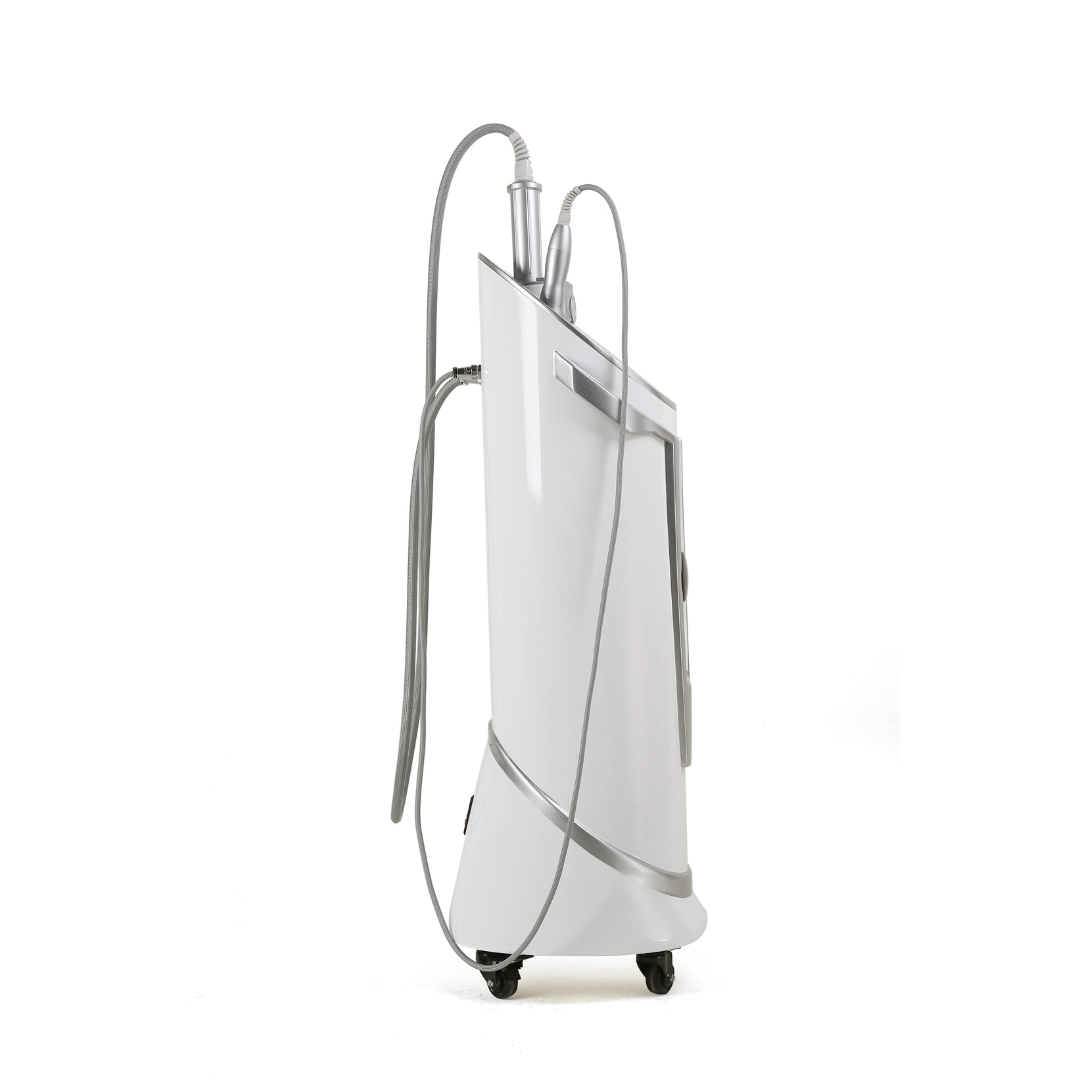 Das Gerät ist mit zwei Handstücken ausgestattet, wodurch die Intensität und Anwendung flexibel an die jeweilige Körperzone angepasst werden kann. Das größere Handstück eignet sich für größere Bereiche wie Oberschenkel, Bauch und Gesäß, während das kleinere eine präzisere Anwendung ermöglicht, beispielsweise im Gesichtsbereich.