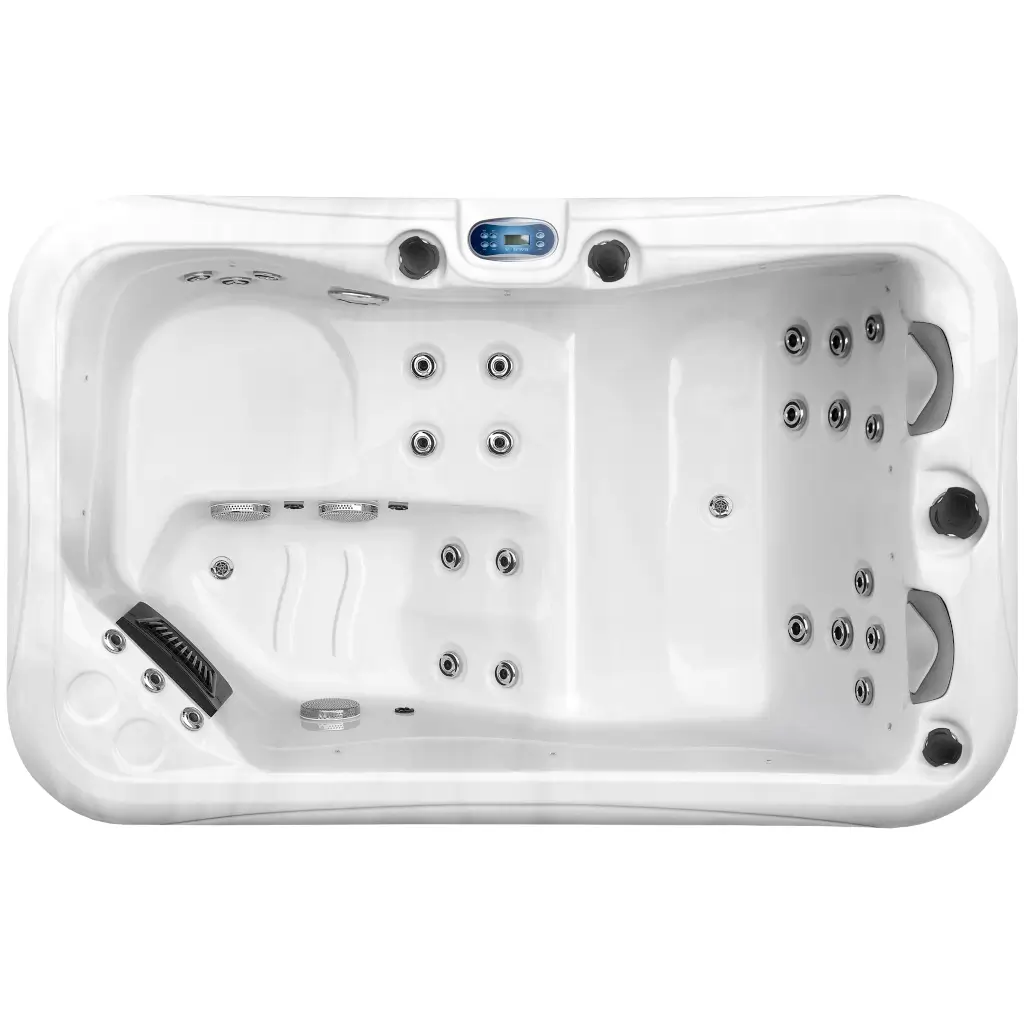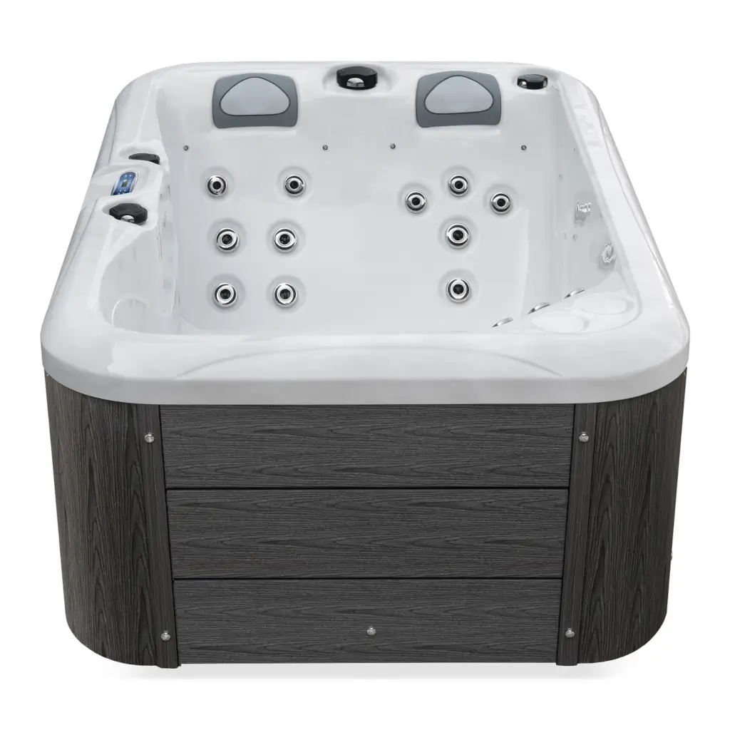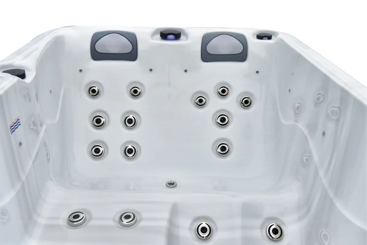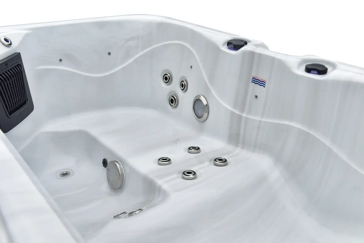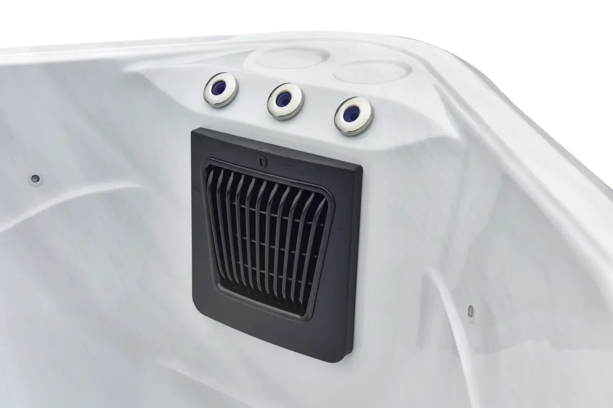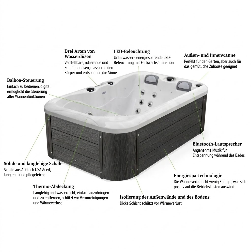 Balboa-Bedienpanel, Wasserheizung 2000 W, LED-Unterwasserbeleuchtung mit Farbwechsel, Filtersystem, Ozonator, Luftregler, Wasseranschlussventil, 3/4-Zoll-Ablauf, Fontänendüsen, Lautsprecher mit BT-System, UV-Filter, Thermoabdeckung