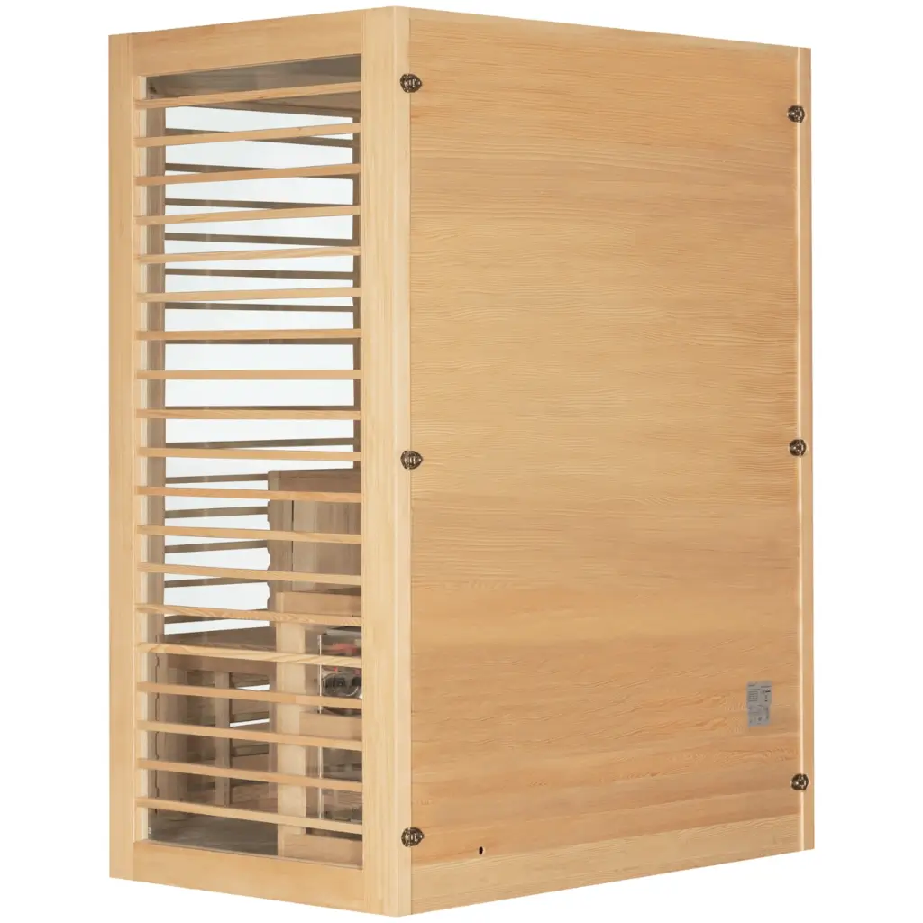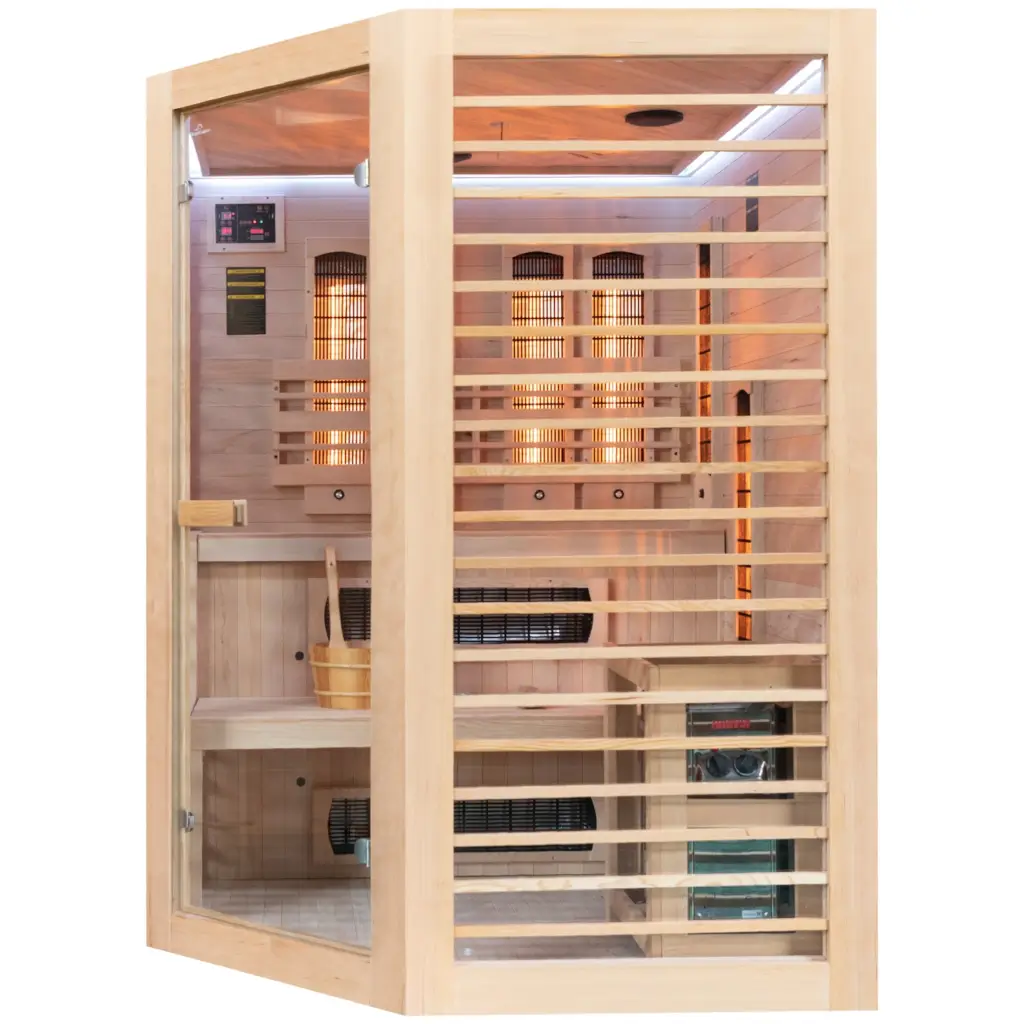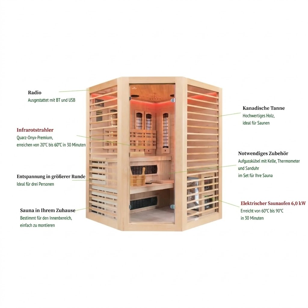 Die Hybrid-Ecksauna Nordum Combi 3-Personen natur vereint die Vorteile einer traditionellen finnischen Sauna und einer modernen Infrarotsauna in einem Gerät. Dieses Modell ist mit einem Elektroofen und Infrarotstrahlern ausgestattet. Dadurch haben Sie mit einem einzigen Gerät die Möglichkeit, sowohl die Wirkung heißer Luft als auch die angenehme Wärme der Infrarotstrahlung zu nutzen. Gefertigt aus kanadischer Hemlocktanne ist die Hybrid-Ecksauna Nordum Combi 3-Personen natur nicht nur funktional, sondern auch ein schönes und natürliches Element der Ausstattung Ihres Hauses oder Gartens. Dieses Modell ist für die gleichzeitige Nutzung durch drei Personen vorgesehen.