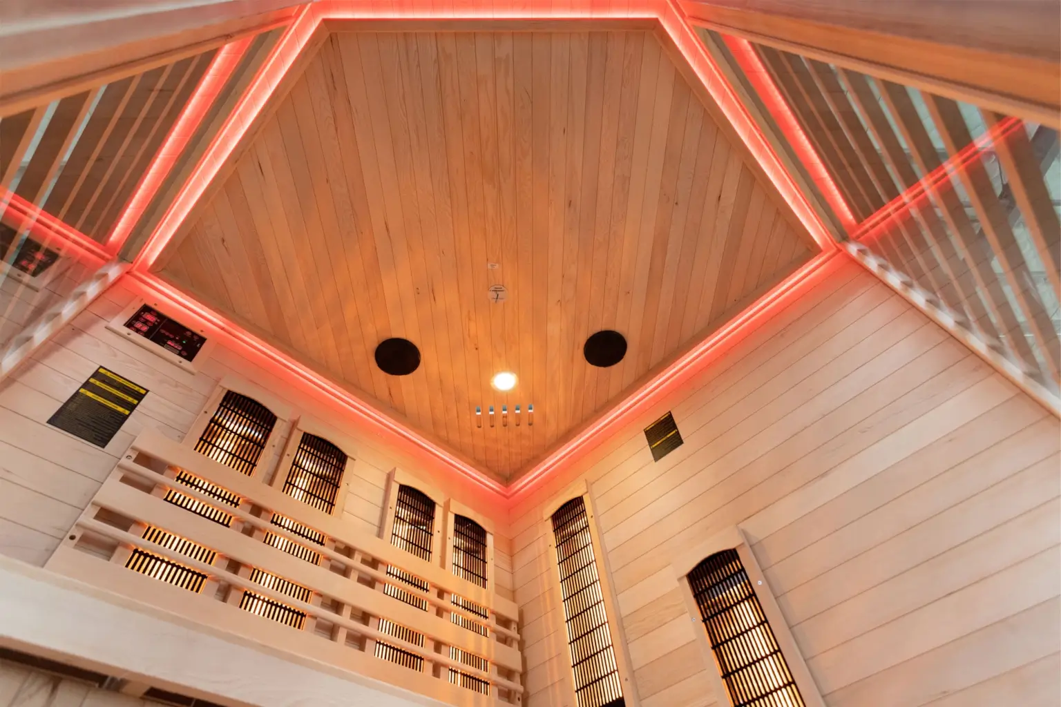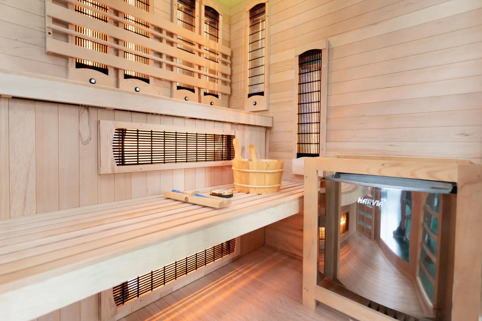 • Multimediaradio mit USB/BT • zwei Stereolautsprecher in der Saunadecke • Innenbeleuchtung • Ofen und Steine • 2 Bedienpanels: außen und innen (ermöglicht die Änderung der Saunaparameter ohne die Sauna während der Entspannung zu verlassen) • fünf Potentiometer zur Einstellung der Strahlerleistung im Rückenbereich • Aufgusseimer mit Kelle zum Befeuchten der Steine • Thermometer • Sanduhr (zur Zeitmessung des Saunagangs) • zusätzliche LED-RGB-Beleuchtung