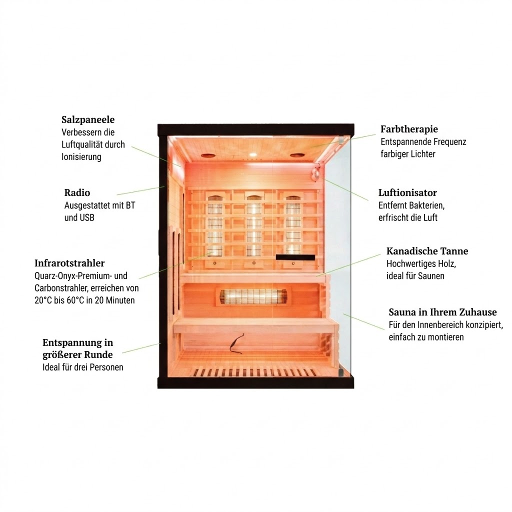 Der Einsatz von Quarzstrahlern Onyx Premium ist eine moderne Lösung mit einem besonders breiten Wirkungsbereich der Infrarotstrahlung. Die Nutzung einer Sauna mit Quarzstrahlern kann zur Entspannung und zu einem verbesserten Wohlbefinden beitragen. Sitzungen von 15 bis 30 Minuten bei einer Temperatur von 45 bis 50 Grad Celsius können Entspannung, Lockerung sowie die Unterstützung von Gewichtsreduktion und der Reduktion von Cellulite fördern. Die positiven Effekte der Sauna können sogar täglich genutzt werden. IR-Saunen unterstützen den Stressabbau und verbessern die Qualität der Erholung. Sie fördern die Hautelastizität, glätten das Hautbild und wirken sich positiv auf das allgemeine Wohlbefinden und die Vitalität aus.