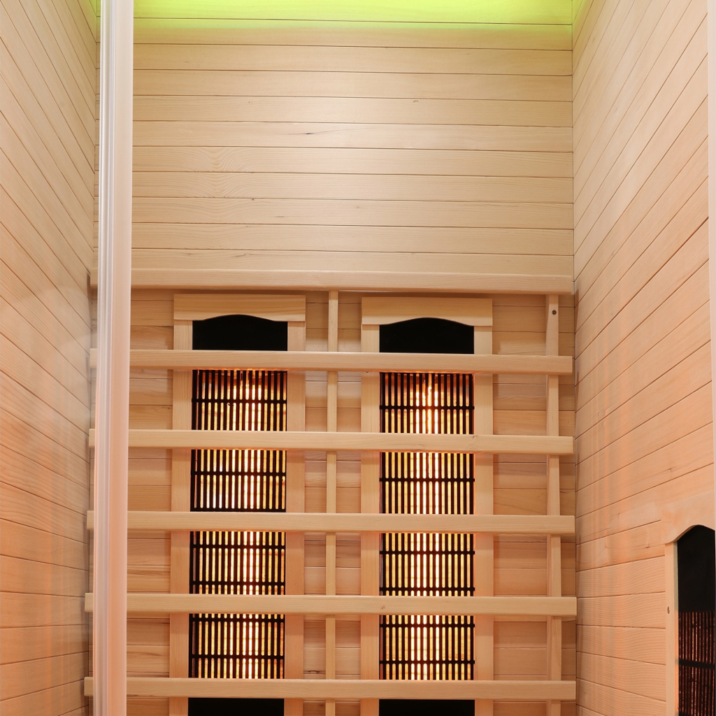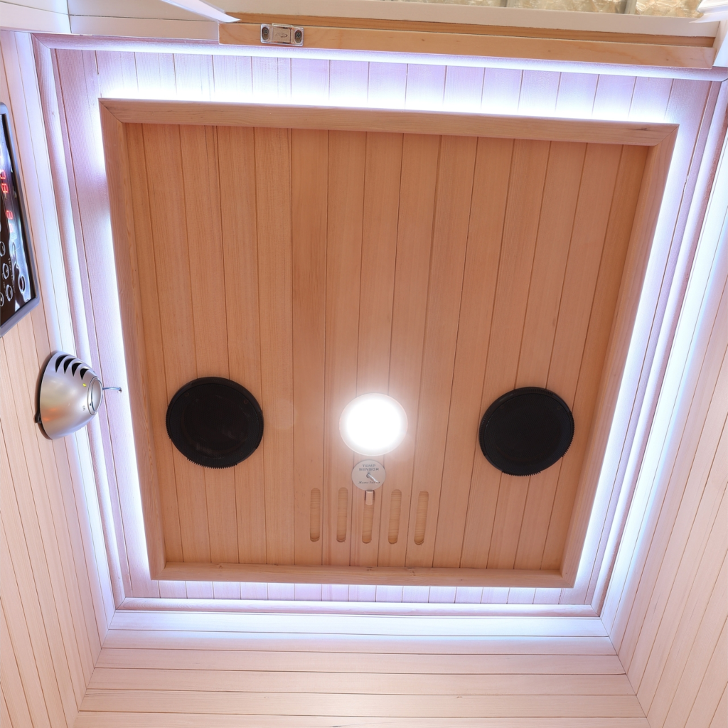 • Multimedia-Radio mit USB/BT • zwei im Dach montierte Stereolautsprecher • internes Bedienpanel (ermöglicht die Änderung der Betriebsparameter, ohne die Sauna während der Entspannung verlassen zu müssen) • Luftionisator zur Auffrischung der Luft und zur Reduzierung unangenehmer Gerüche • Beleuchtungssystem mit einstellbarer, entspannender Farbwechsel-Funktion • Innenbeleuchtung • Türen und Scheiben aus gehärtetem Glas