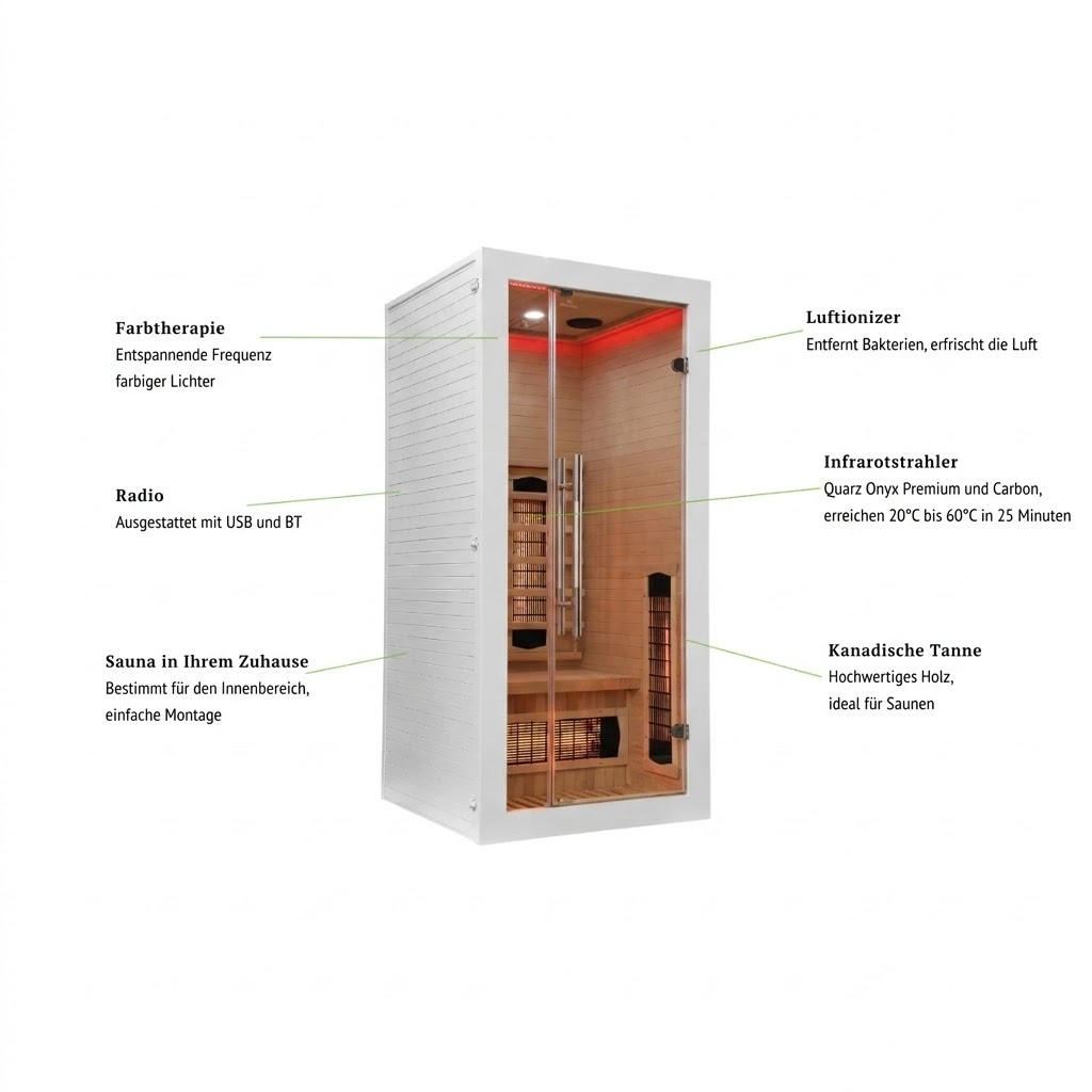 Infrarotsauna Nordum Basic 1-Personen Weiß – genieße angenehme Entspannung in deinem eigenen Zuhause! Diese Ein-Personen-Sauna ermöglicht es dir, auch bei begrenztem Platzangebot eine eigene Spa-Zone zu schaffen. Es handelt sich um eine Niedertemperatur-Konstruktion mit einem Temperaturbereich von 20°C–60°C.